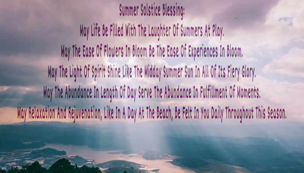 May life be filled with the laughter of summers at play. May the ease of flowers in bloom be the ease of experiences in bloom. May the light of spirit shine like the midday summer sun in all of its fiery glory. May the abundance in length of the day serve the abundance in fulfillments of moments. May relaxation and rejuvenation, like in a day at the beach, be felt in you daily throughout this season.